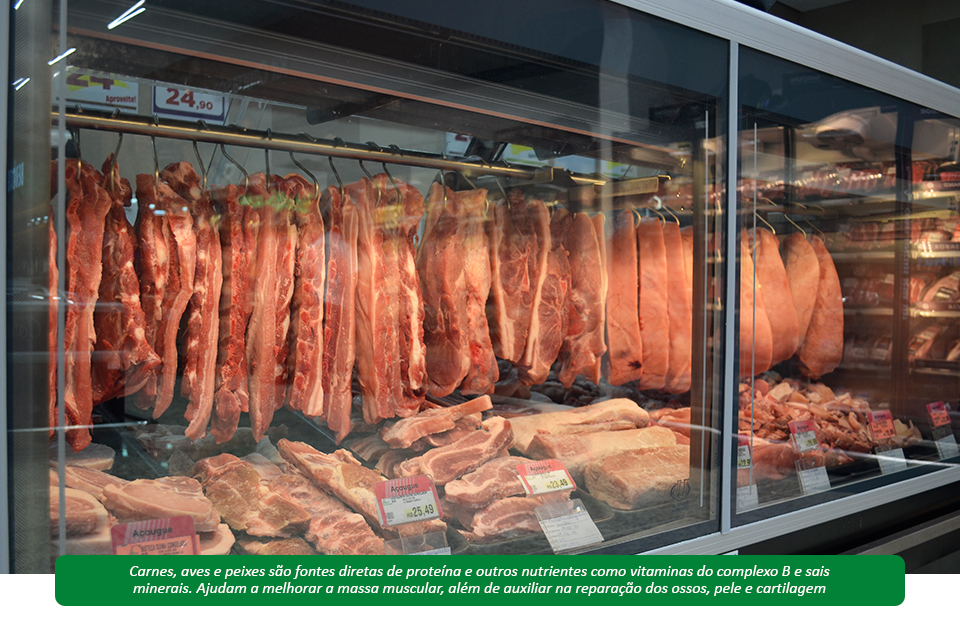 Escolha carnes vermelhas (patinho, maminha, músculo, lagarto, filé, coxão-duro e coxão-mole, pobres em gorduras saturadas) e porco com menos gordura (peito, lombo e pernil). Opte também aves (peito de frango) e peixes (tilápia, badejo, namorado e pescada).