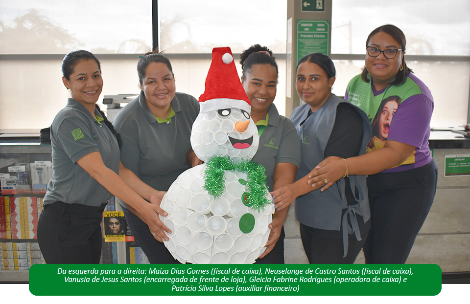 Em meio à rotina acelerada e ao fluxo de clientes, uma iniciativa criativa e sustentável chamou a atenção na Loja 49 do Supermercado Copercana, em Sertãozinho, onde cinco colaboradoras transformaram copos descartáveis usados pelos consumidores em uma obra natalina.